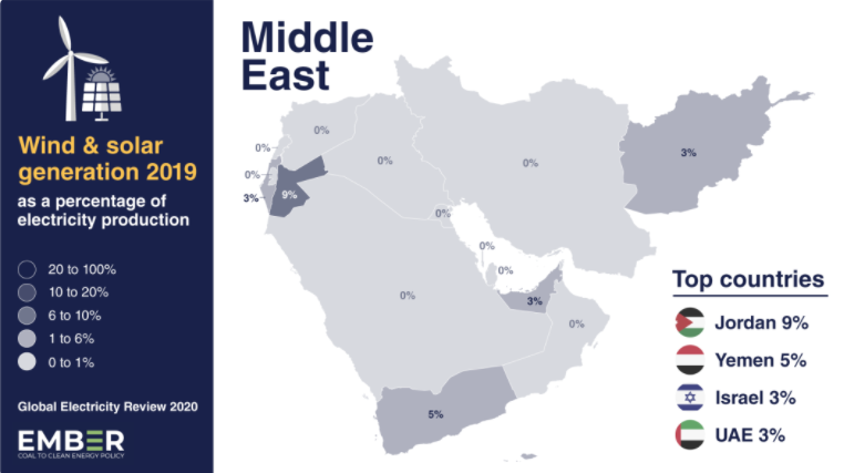 中东只有1%的电力来自风能和太阳能,远远落后于世界其他地区。主要国家是约旦(9%)、也门(5%)、以色列(3%)和阿拉伯联合酋长国(3%);处于更落后状态的国家包括伊朗(0.4%)、沙特阿拉伯(0.2%)和伊拉克(0.1%)。