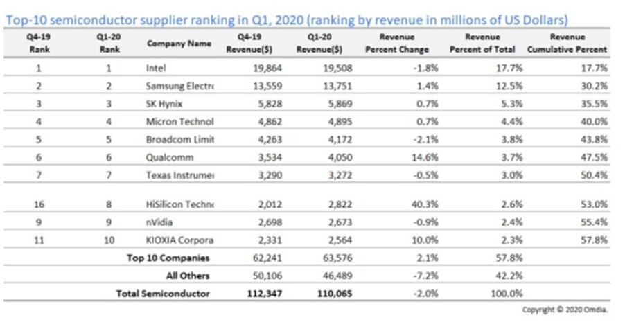 海思半导体在2020年第一季度比2019年第四季度增长了40.3%,震动了市场。海思半导体是华为在中国的芯片部门。Ellwanger表示,海思通过建立库存以抵制9月生效的美国贸易限制措施,保护自己免受中美贸易战的影响。海思第一季度的收入为28亿美元。