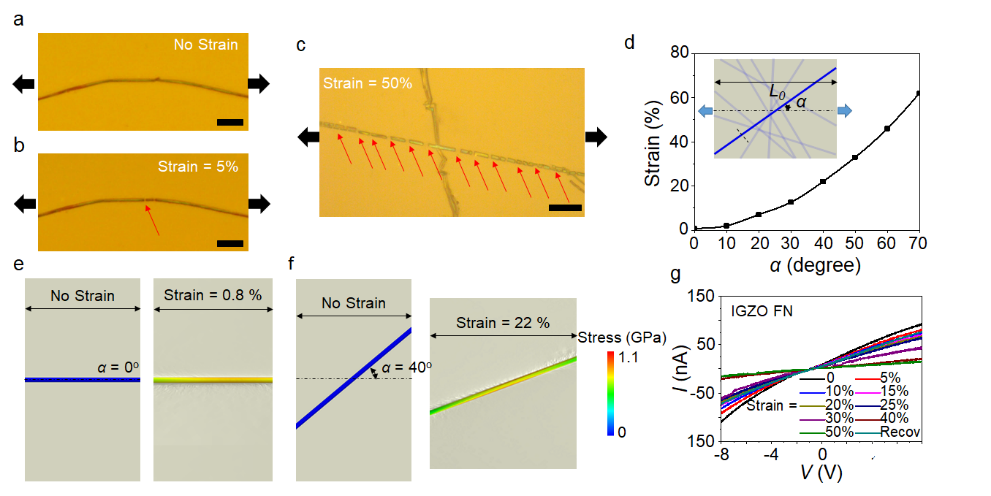 金属氧化物(MO)半导体(例如IGZO,SnO2,ZnO)和导体(ITO,FTO)等已被大规模成熟的应用在显示器,触摸屏和传感器等领域。从而证明了其在多个方面比上述材料显示出更加优异和稳定的性能。但是,可以维持最大断裂水平约1%的块状金属氧化物本质上很难拉伸到WEST所需的应变程度。