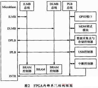 系统核心采用嵌入式技术,在一片芯片上实现,它包含Xilinx公司的一些标准总线IP核如中断控制器,通用输入输出端口等模块和带有PLB总线接口的用户自定义的数据采集与存储IP核。其中用户自定义的IP核是用VHDL语言设计的,它包含AD控制逻辑、FLASH控制逻辑、DMA传输控制逻辑和FIFO缓存模块等。