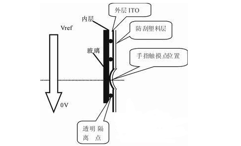 电阻触摸屏的屏体部分是一块多层复合薄膜,由一层玻璃或有机玻璃作为基层,表面涂有一层透明的导电层(ITO膜),上面再盖有一层外表面经过硬化处理、光滑防刮的塑料层。它的内表面也涂有一层ITO,在两层导电层之间有许多细小(小于千分之一英寸)的透明隔离点把它们隔开。