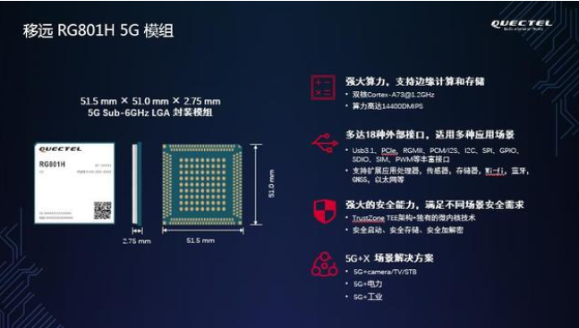 基于海思5G模组中间件的5G多模模组RG801H采用4天线设计,能够帮助下游终端客户减少天线数量、减少成本、减少工作量。总结而言,RG801H主要具备四大优势:一是强大算力,支持边缘计算和存储,1.2GHz主频,算力高达14400DMIPS;