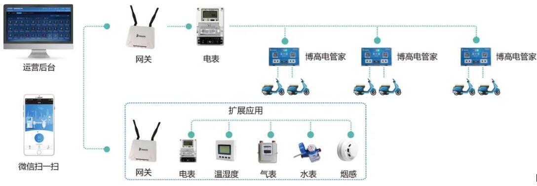 为了解决传统充电方案中的诸多问题,博高信息推出了基于LoRa的智能充电解决方案,其网络架构图如图所示。整个系统包括博高信息自主研发的“博高电管家”智能充电设备和博高电管家云平台、基于LoRaWAN协议的网关、II型采集器、核心网服务器程序和智能电表。