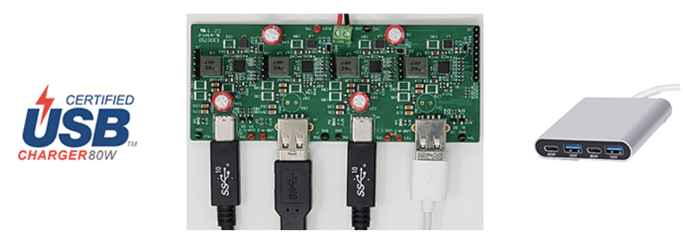 比如下面这个采用四颗ACT4751,配合Cypress的USB控制器CCG3PA设计的四端口USB充电集线器参考设计,在一块电路板上同时支持两个80W USB-C PD通道和两个7.5W USB-A通道,功率总计达到175W。该电源充电器方案通过了USB-IF的USB-PD 3.0认证,在此基础上进行开发可大大简化设计流程。
